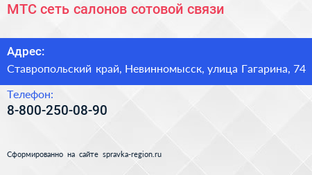 МТС, сеть салонов сотовой связи по адресу Ставропольский край, Невинномысск, улица Гагарина, 74 в дальнейшем Организация, размещена в следующих категориях: