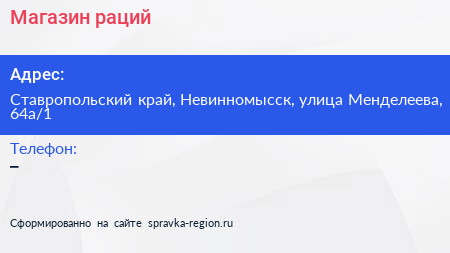 Магазин раций по адресу Ставропольский край, Невинномысск, улица Менделеева, 64а/1 в дальнейшем Организация, размещена в следующих категориях: