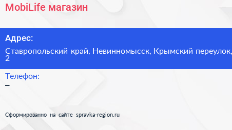 MobiLife, магазин по адресу Ставропольский край, Невинномысск, Крымский переулок, 2 в дальнейшем Организация, размещена в следующих категориях: