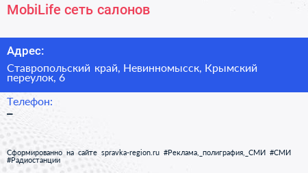 MobiLife, сеть салонов по адресу Ставропольский край, Невинномысск, Крымский переулок, 6 в дальнейшем Организация, размещена в следующих категориях: