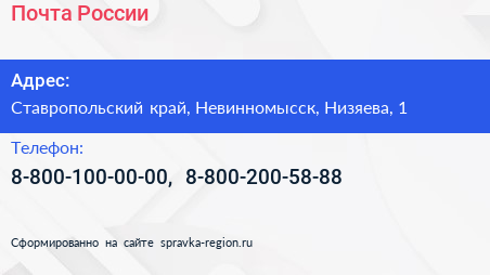 Почта России по адресу Ставропольский край, Невинномысск, Низяева, 1 в дальнейшем Организация, размещена в следующих категориях: