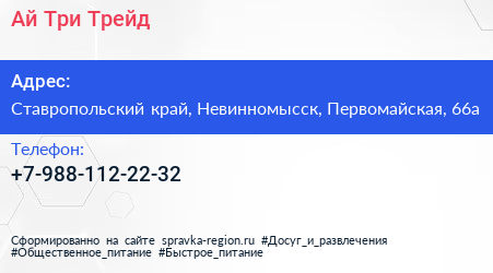 Ай Три Трейд по адресу Ставропольский край, Невинномысск, Первомайская, 66а в дальнейшем Организация, размещена в следующих категориях: