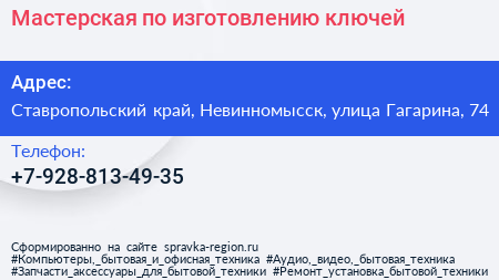 Мастерская по изготовлению ключей по адресу Ставропольский край, Невинномысск, улица Гагарина, 74 в дальнейшем Организация, размещена в следующих категориях: