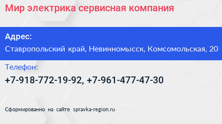 Мир электрика, сервисная компания по адресу Ставропольский край, Невинномысск, Комсомольская, 20 в дальнейшем Организация, размещена в следующих категориях: