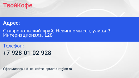 ТвойКофе по адресу Ставропольский край, Невинномысск, улица 3 Интернационала, 128 в дальнейшем Организация, размещена в следующих категориях: