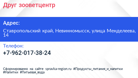 Друг, зооветцентр по адресу Ставропольский край, Невинномысск, улица Менделеева, 14 в дальнейшем Организация, размещена в следующих категориях: