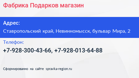 Фабрика Подарков, магазин по адресу Ставропольский край, Невинномысск, бульвар Мира, 2 в дальнейшем Организация, размещена в следующих категориях: