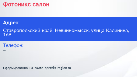 Фотоникс, салон по адресу Ставропольский край, Невинномысск, улица Калинина, 169 в дальнейшем Организация, размещена в следующих категориях: