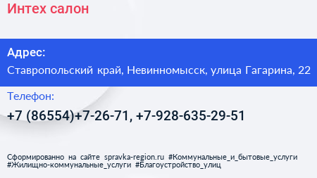 Интех, салон по адресу Ставропольский край, Невинномысск, улица Гагарина, 22 в дальнейшем Организация, размещена в следующих категориях: