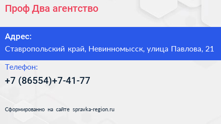 Проф-Два, агентство по адресу Ставропольский край, Невинномысск, улица Павлова, 21 в дальнейшем Организация, размещена в следующих категориях: