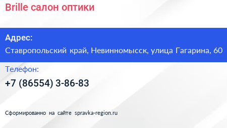 Brille, салон оптики по адресу Ставропольский край, Невинномысск, улица Гагарина, 60 в дальнейшем Организация, размещена в следующих категориях: