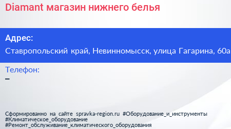 Diamant, магазин нижнего белья по адресу Ставропольский край, Невинномысск, улица Гагарина, 60а в дальнейшем Организация, размещена в следующих категориях: