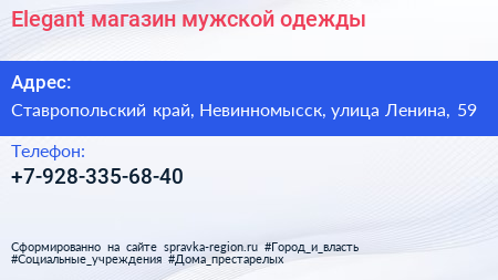 Elegant, магазин мужской одежды по адресу Ставропольский край, Невинномысск, улица Ленина, 59 в дальнейшем Организация, размещена в следующих категориях: