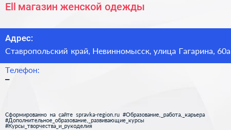 Ell`, магазин женской одежды по адресу Ставропольский край, Невинномысск, улица Гагарина, 60а в дальнейшем Организация, размещена в следующих категориях: