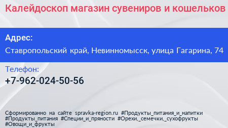 Калейдоскоп, магазин сувениров и кошельков по адресу Ставропольский край, Невинномысск, улица Гагарина, 74 в дальнейшем Организация, размещена в следующих категориях: