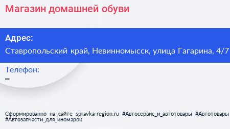 Магазин домашней обуви по адресу Ставропольский край, Невинномысск, улица Гагарина, 4/7 в дальнейшем Организация, размещена в следующих категориях:
