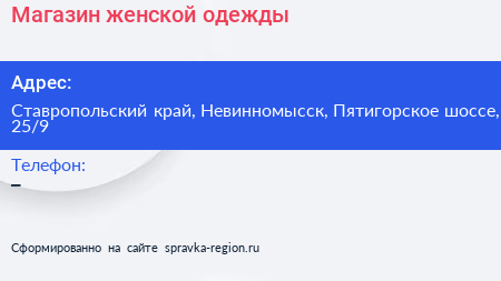 Магазин женской одежды по адресу Ставропольский край, Невинномысск, Пятигорское шоссе, 25/9 в дальнейшем Организация, размещена в следующих категориях: