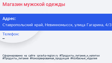 Магазин мужской одежды по адресу Ставропольский край, Невинномысск, улица Гагарина, 4/3 в дальнейшем Организация, размещена в следующих категориях: