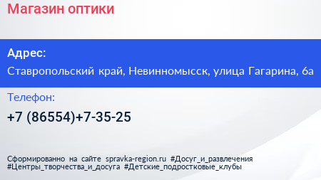 Магазин оптики по адресу Ставропольский край, Невинномысск, улица Гагарина, 6а в дальнейшем Организация, размещена в следующих категориях: