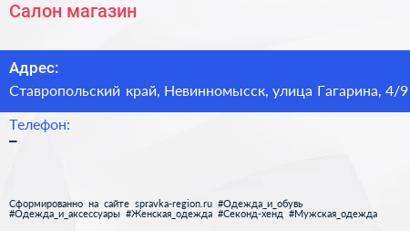 Салон-магазин по адресу Ставропольский край, Невинномысск, улица Гагарина, 4/9 в дальнейшем Организация, размещена в следующих категориях: