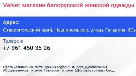 Velvet, магазин белорусской женской одежды по адресу Ставропольский край, Невинномысск, улица Гагарина, 60а в дальнейшем Организация, размещена в следующих категориях: