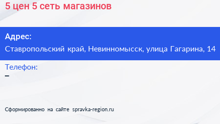 5 цен+5, сеть магазинов по адресу Ставропольский край, Невинномысск, улица Гагарина, 14 в дальнейшем Организация, размещена в следующих категориях: