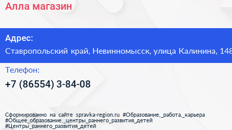 Алла, магазин по адресу Ставропольский край, Невинномысск, улица Калинина, 148 в дальнейшем Организация, размещена в следующих категориях: