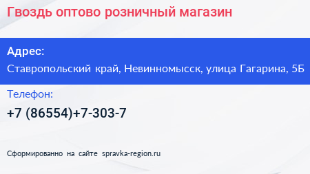 Гвоздь, оптово-розничный магазин по адресу Ставропольский край, Невинномысск, улица Гагарина, 5Б в дальнейшем Организация, размещена в следующих категориях: