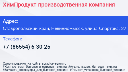 ХимПродукт, производственная компания по адресу Ставропольский край, Невинномысск, улица Спартака, 27 в дальнейшем Организация, размещена в следующих категориях: