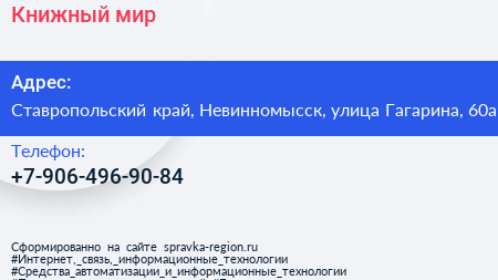 Книжный мир по адресу Ставропольский край, Невинномысск, улица Гагарина, 60а в дальнейшем Организация, размещена в следующих категориях: