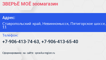 ЗВЕРЬЁ МОЁ, зоомагазин по адресу Ставропольский край, Невинномысск, Пятигорское шоссе, 11 в дальнейшем Организация, размещена в следующих категориях: