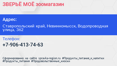ЗВЕРЬЁ МОЁ, зоомагазин по адресу Ставропольский край, Невинномысск, Водопроводная улица, 362 в дальнейшем Организация, размещена в следующих категориях: