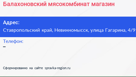 Балахоновский мясокомбинат, магазин по адресу Ставропольский край, Невинномысск, улица Гагарина, 4/9 в дальнейшем Организация, размещена в следующих категориях: