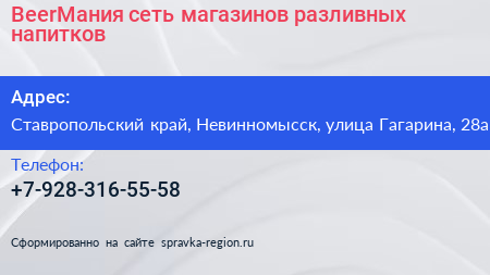 BeerМания, сеть магазинов разливных напитков по адресу Ставропольский край, Невинномысск, улица Гагарина, 28а в дальнейшем Организация, размещена в следующих категориях: