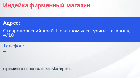 Индейка, фирменный магазин по адресу Ставропольский край, Невинномысск, улица Гагарина, 4/10 в дальнейшем Организация, размещена в следующих категориях: