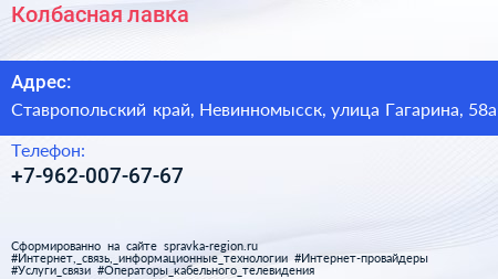 Колбасная лавка по адресу Ставропольский край, Невинномысск, улица Гагарина, 58а в дальнейшем Организация, размещена в следующих категориях:
