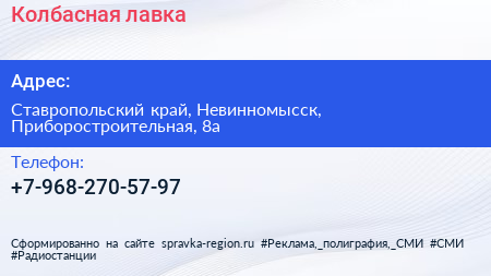 Колбасная лавка по адресу Ставропольский край, Невинномысск, Приборостроительная, 8а в дальнейшем Организация, размещена в следующих категориях:
