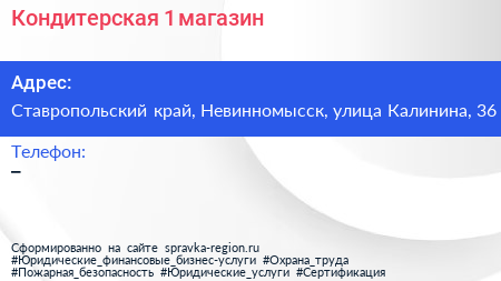 Кондитерская №1, магазин по адресу Ставропольский край, Невинномысск, улица Калинина, 36 в дальнейшем Организация, размещена в следующих категориях: