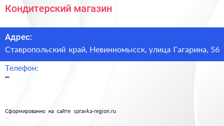 Кондитерский магазин по адресу Ставропольский край, Невинномысск, улица Гагарина, 56 в дальнейшем Организация, размещена в следующих категориях: