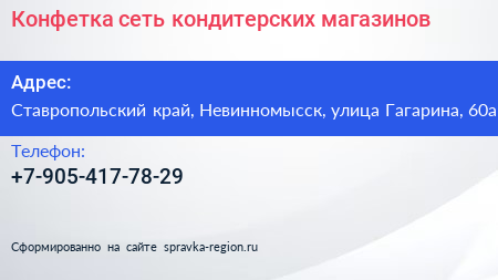 Конфетка, сеть кондитерских магазинов по адресу Ставропольский край, Невинномысск, улица Гагарина, 60а в дальнейшем Организация, размещена в следующих категориях: