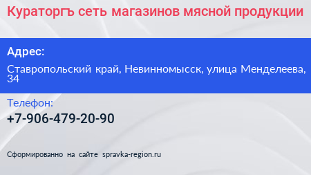 Кураторгъ, сеть магазинов мясной продукции по адресу Ставропольский край, Невинномысск, улица Менделеева, 34 в дальнейшем Организация, размещена в следующих категориях: