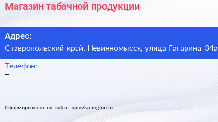 Магазин табачной продукции по адресу Ставропольский край, Невинномысск, улица Гагарина, 34а в дальнейшем Организация, размещена в следующих категориях: