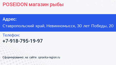 POSEIDON, магазин рыбы по адресу Ставропольский край, Невинномысск, 30 лет Победы, 20 в дальнейшем Организация, размещена в следующих категориях: