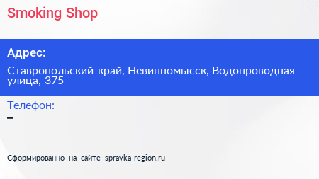 Smoking Shop по адресу Ставропольский край, Невинномысск, Водопроводная улица, 375 в дальнейшем Организация, размещена в следующих категориях:
