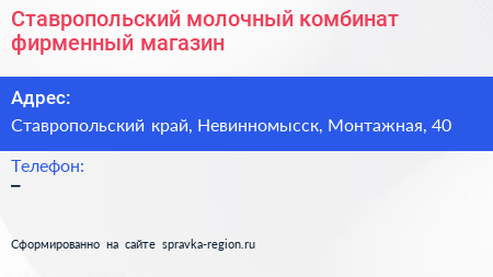 Ставропольский молочный комбинат, фирменный магазин по адресу Ставропольский край, Невинномысск, Монтажная, 40 в дальнейшем Организация, размещена в следующих категориях: