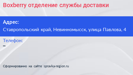 Boxberry, отделение службы доставки по адресу Ставропольский край, Невинномысск, улица Павлова, 4 в дальнейшем Организация, размещена в следующих категориях: