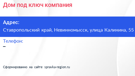 Дом под ключ, компания по адресу Ставропольский край, Невинномысск, улица Калинина, 55 в дальнейшем Организация, размещена в следующих категориях:
