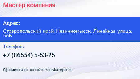 Мастер, компания по адресу Ставропольский край, Невинномысск, Линейная улица, 56Б в дальнейшем Организация, размещена в следующих категориях: