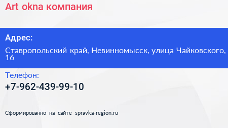Art-okna, компания по адресу Ставропольский край, Невинномысск, улица Чайковского, 16 в дальнейшем Организация, размещена в следующих категориях: