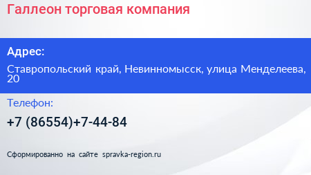 Галлеон, торговая компания по адресу Ставропольский край, Невинномысск, улица Менделеева, 20 в дальнейшем Организация, размещена в следующих категориях: